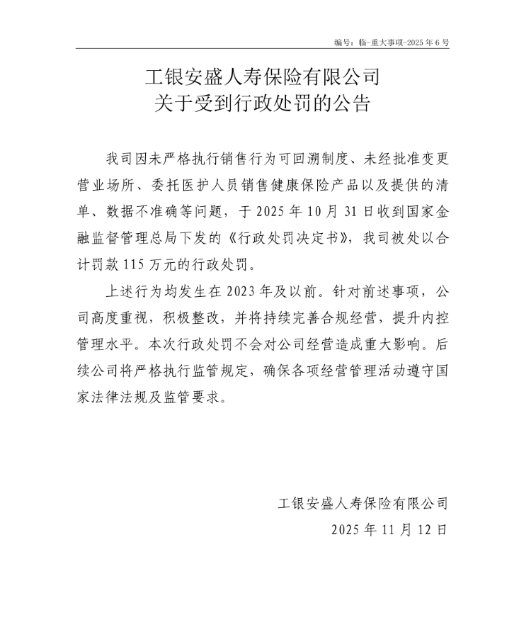 海报新闻记者 刘静一报道 日前,工银安盛人寿在官网发布公告称,受到行政处罚。声明截图 声明称,工银安盛人寿因未严格执行销售行为追踪制度、擅自改变营业地点、委托医务人员销售健康险产品、提供不准确清单和数据等罪名,于今年10月31日被国家金融监督管理局罚款115万元。工银安盛人寿在声明中表示,此前所有违规行为均发生在2023年之前,公司正在积极纠正,并持续改进合规运营,提升内控管理水平。据工银安盛人寿官网显示,自2025年1月至今,工银安盛人寿共收到各金融监管部门的罚款5次。违规行为包括销售管理和数据治理等方面。资料来源:工银安盛人寿官网 据公开资料显示,工银安盛人寿保险股份有限公司成立于2012年7月19日,在上海上市,注册资本125.5亿元。其前身为金盛人寿保险股份有限公司,中国工商银行为大股东,持有工银安盛人寿60%的股权。